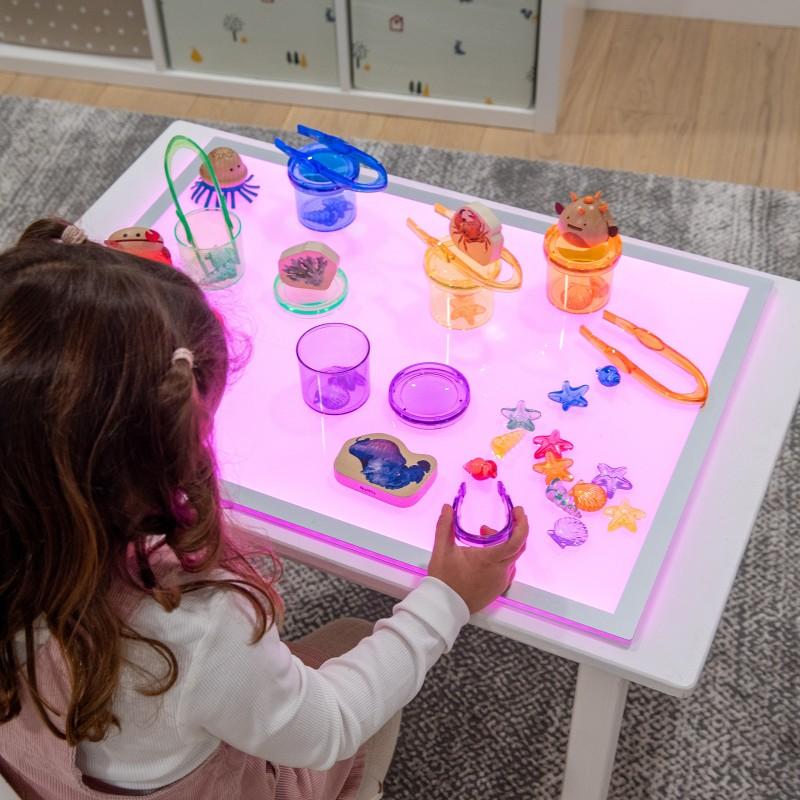 With a simple built-in control button, children can easily cycle through eight vibrant colours, including pure white, and adjust between three brightness levels to suit any activity. Perfect for exploring light, colour, and shape, supporting group collaboration, or encouraging independent investigation, the panel’s gentle glow creates an inviting backdrop for focused, hands-on learning.