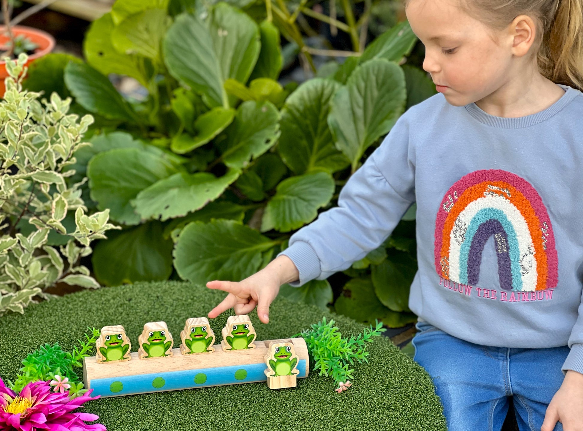 Ideal for extending mathematical learning and language through play, children will delight in singing the popular song Five Little Speckled Frogs whilst actively jumping each frog from the log into the cool pool!
