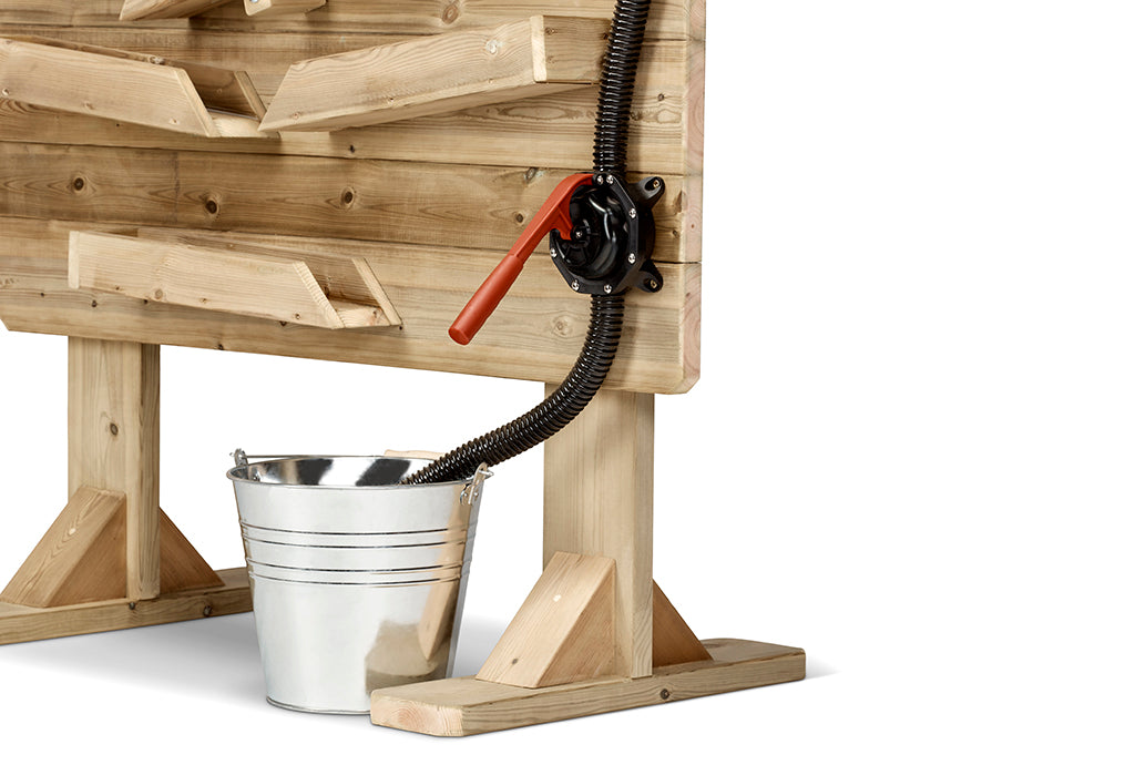 A wonderful outdoor learning resource which encourages children to experiment with water. The freestanding, sturdy design features a water pump, trough and 6 x wooden water chutes. The pump transports the water to the top chute and from there it flows down the wall and collects in the trough below - ready for the cycle to begin again.