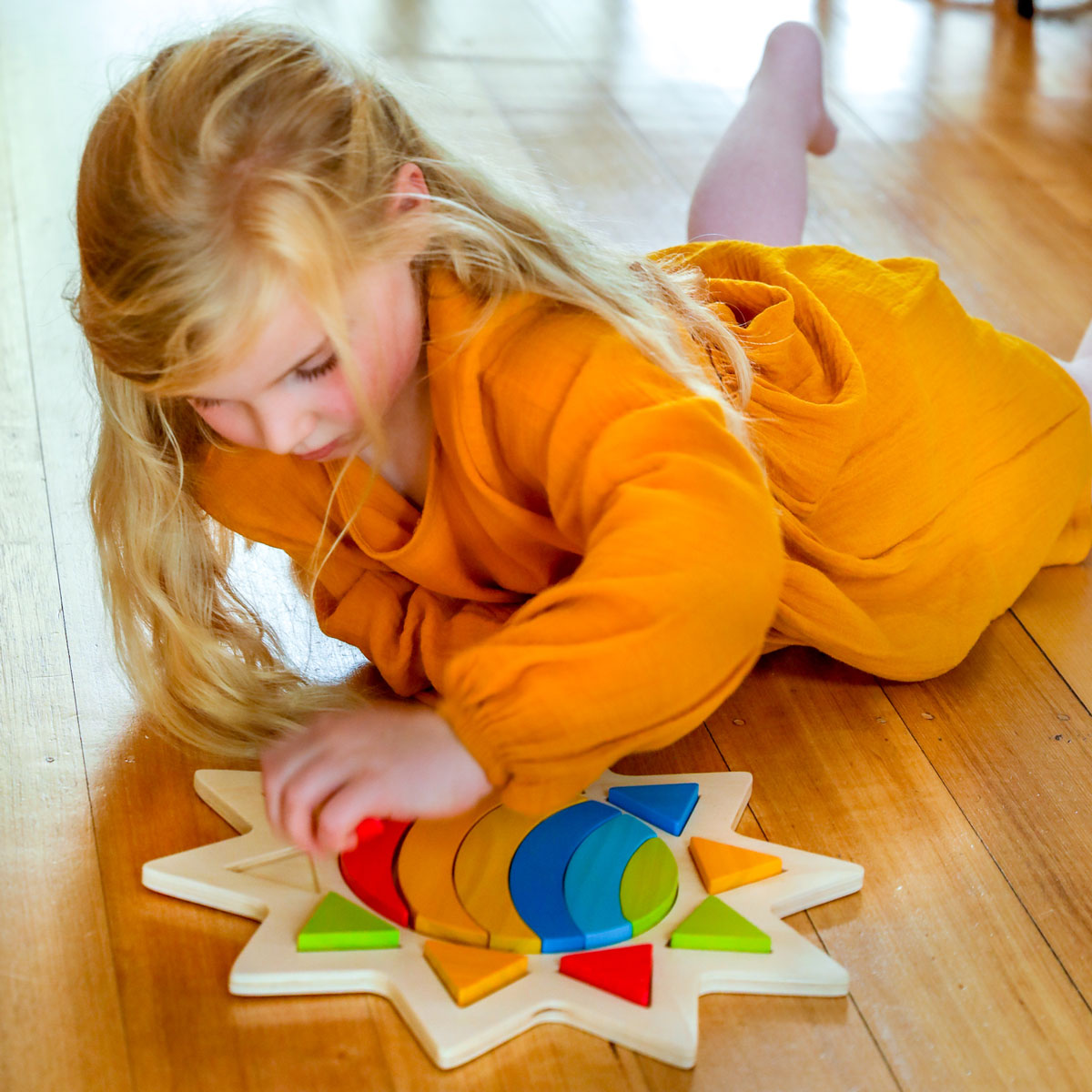 Shaped like the sun, the puzzle includes 16 brightly coloured pieces.